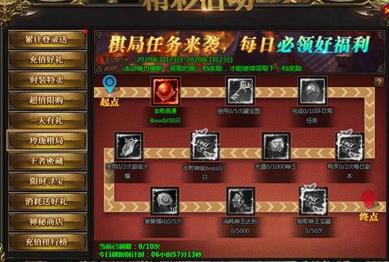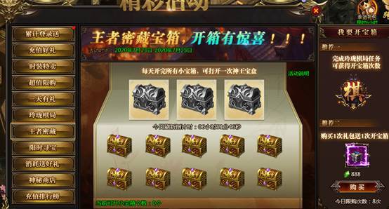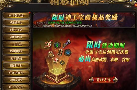 活动说明:神王宝藏限时发放极品装备、神器等,全服寻宝达到一定次数可获得保底奖励