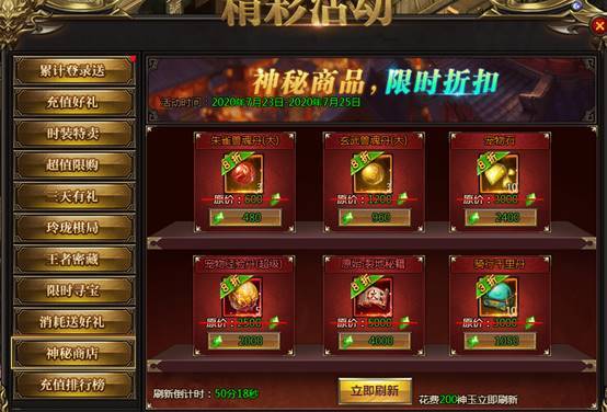 活动说明:神秘商店限时来袭,超低折扣,限时购买。同时可以通过刷新按钮,花费200神玉进行刷新