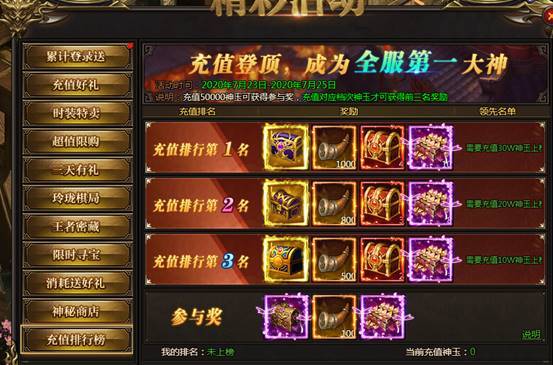 活动说明:名动本服,充值达到100000神玉即可参与排行,前三名均可获得极品自选宝箱。充值达到50000神玉即可获得参与奖。奖励会在活动结束后通过邮件发放