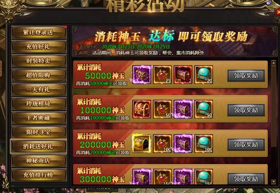 活动说明:活动期间,消耗神玉可以领取奖励,帮会、集市消耗除外