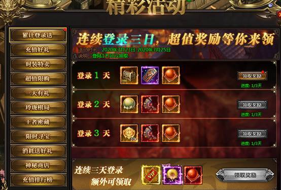 活动说明:活动期间,每天登陆即可领取奖励,连续三天更有额外奖励