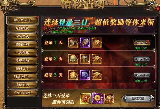 活动说明:活动期间,每天登陆即可领取奖励,连续三天更有额外奖励