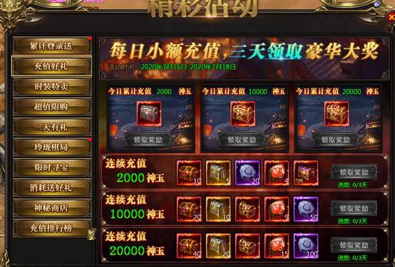 活动说:每日充值可以领取充值宝箱,连续三天充值更有额外极品奖励