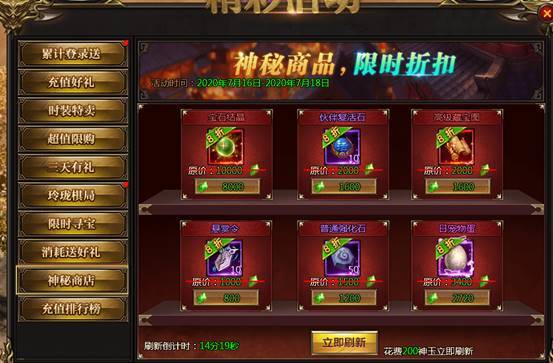 活动说明:神秘商店限时来袭,超低折扣,限时购买。同时可以通过刷新按钮,花费200神玉进行刷新