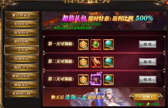 活动说明:一次购买,未来三天每日皆可领取极品奖励,助力成神
