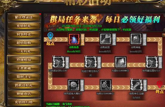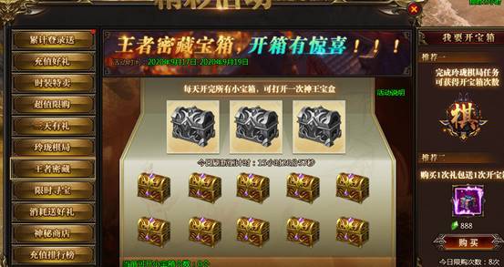 活动说明:神王宝藏限时发放极品装备、神器等,全服寻宝达到一定次数可获得保底奖励