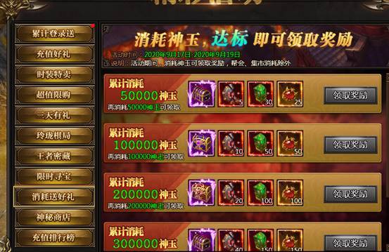 活动说明:活动期间,消耗神玉可以领取奖励,帮会、集市消耗除外