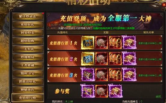 活动说明:名动本服,充值达到100000神玉即可参与排行,前三名均可获得极品自选宝箱。充值达到50000神玉即可获得参与奖。奖励会在活动结束后通过邮件发放