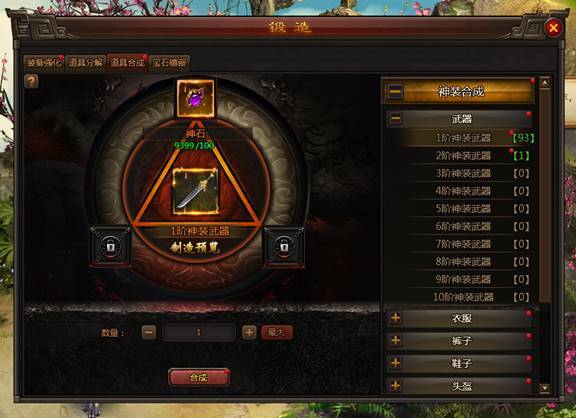 通过合成不同的神装所消耗不同的材料数量,神装升阶是消耗低阶同神装和相应的神石材料数量,神装阶数越高,增加的属性越好。