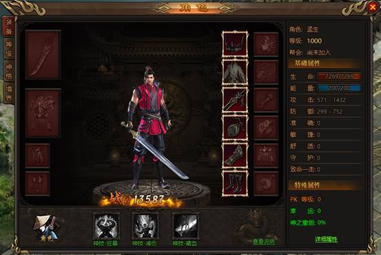 在人物界面的左下角点神装会跳转到神装界面,可以用神石合成神装,集齐一套神装后激活神技,体会不一样的游戏体验,套装等级越高,神技等级越高,效果越好