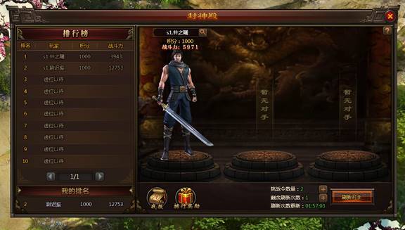 神功大成却无人可敌?但人外有人,竞技场满足您的战意。武林争夺,挑战天下英豪,登上武林巅峰,每天六点结算当天排行榜奖励,每周结算一次整体排行榜,发放排名奖励和排名称号。