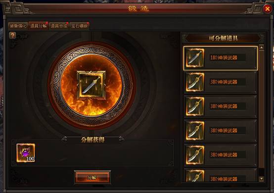 分解多余的神器、神器卷轴以及神装等特殊物品,分解出来的材料可以合成需要的神器、神装。