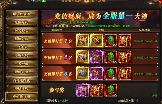 活动说明:名动本服,充值达到100000神玉即可参与排行,前三名均可获得极品自选宝箱。充值达到50000神玉即可获得参与奖。奖励会在活动结束后通过邮件发放
