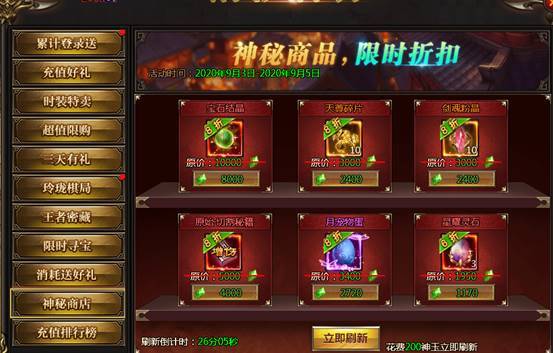 活动说明:神秘商店限时来袭,超低折扣,限时购买。同时可以通过刷新按钮,花费200神玉进行刷新