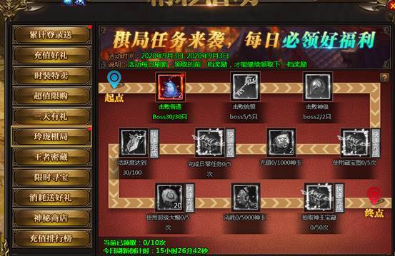 活动说明:神王宝藏限时发放极品装备、神器等,全服寻宝达到一定次数可获得保底奖励