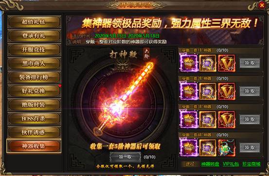 开服第4-7天,穿戴一整套对应阶数的神器可获得奖励。