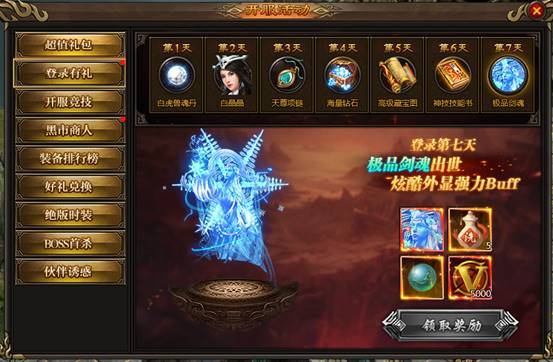 开服后每天登陆都可以免费领取丰厚奖励,更有极品伙伴、天尊装备、神技、极品剑魂领取
