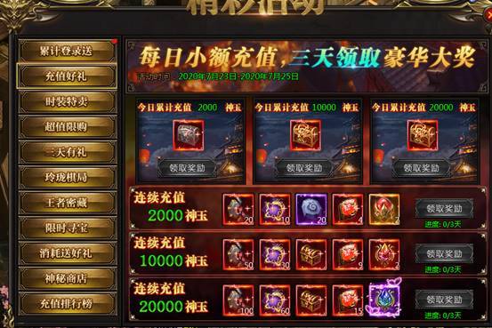 活动说:每日充值可以领取充值宝箱,连续三天充值更有额外极品奖励