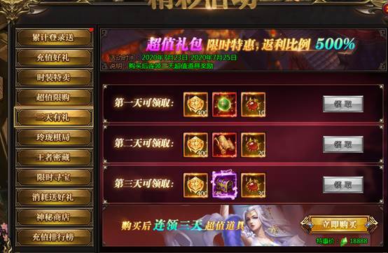 活动说明:一次购买,未来三天每日皆可领取极品奖励,助力成神