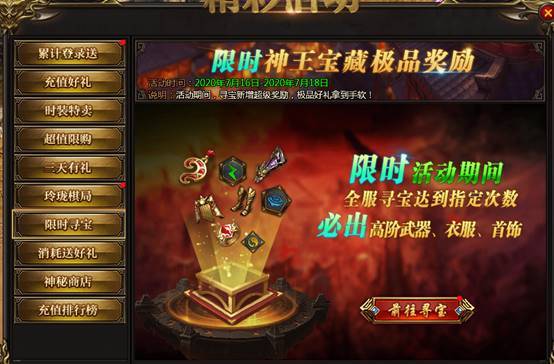 活动说明:神王宝藏限时发放极品装备、神器等,全服寻宝达到一定次数可获得保底奖励