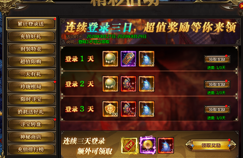 活动说明:活动期间,每天登陆即可领取奖励,连续三天更有额外奖励