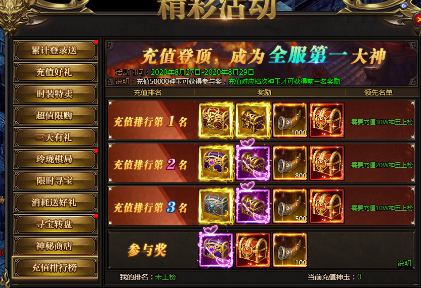 活动说明:名动本服,充值达到100000神玉即可参与排行,前三名均可获得极品自选宝箱。充值达到50000神玉即可获得参与奖。奖励会在活动结束后通过邮件发放