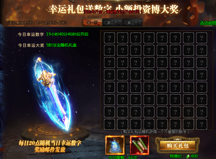活动说明:购买礼包获得幸运数字,即可参与超级大奖