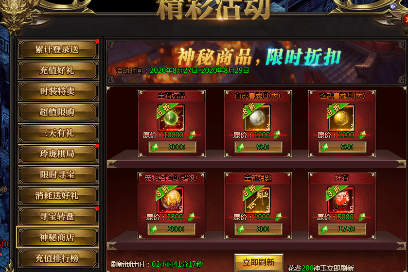 活动说明:神秘商店限时来袭,超低折扣,限时购买。同时可以通过刷新按钮,花费200神玉进行刷新