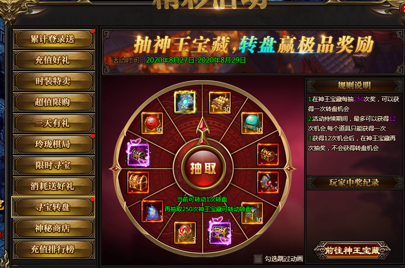 活动说明:每抽取250次神王宝藏可获得转盘机会,转动转盘获得极品保底奖励
