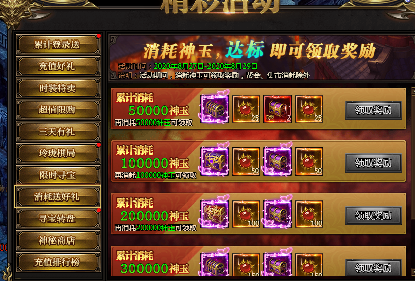 活动说明:活动期间,消耗神玉可以领取奖励,帮会、集市消耗除外