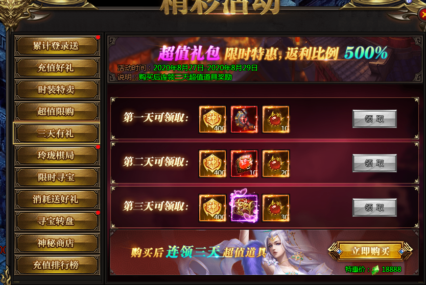 活动说明:一次购买,未来三天每日皆可领取极品奖励,助力成神