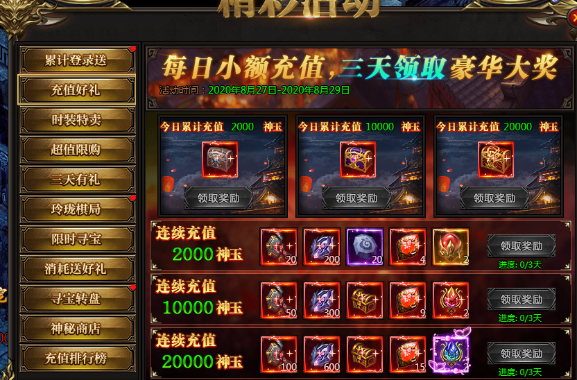 活动说:每日充值可以领取充值宝箱,连续三天充值更有额外极品奖励