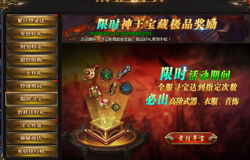活动说明:神王宝藏限时发放极品装备、神器等,全服寻宝达到一定次数可获得保底奖励
