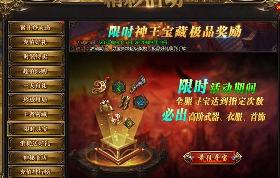 活动说明:神王宝藏限时发放极品装备、神器等,全服寻宝达到一定次数可获得保底奖励