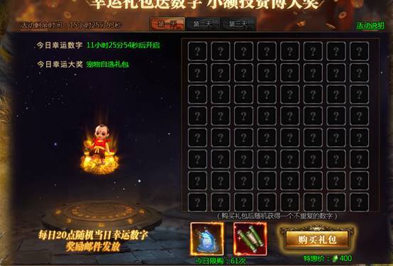 活动说明:购买礼包获得幸运数字,即可参与超级大奖