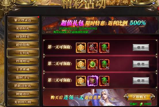 活动说明:一次购买,未来三天每日皆可领取极品奖励,助力成神