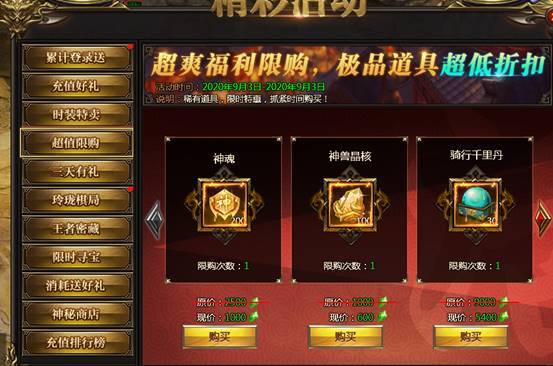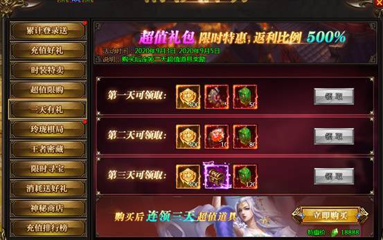 活动说明:一次购买,未来三天每日皆可领取极品奖励,助力成神