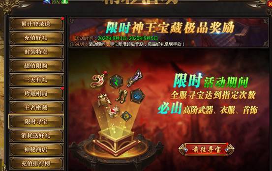 活动说明:神王宝藏限时发放极品装备、神器等,全服寻宝达到一定次数可获得保底奖励