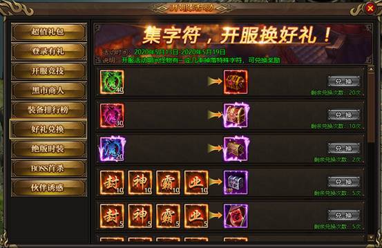 开服活动期间怪物有一定几率掉落特殊字符,可兑换奖励,更可兑换封神所需的神魂。