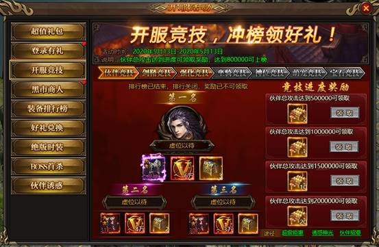 第一天:伙伴竞技 伙伴总攻击达到进度可领取奖励,达到800000可上榜
